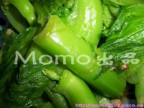 2.热锅,倒入适量的油,加入蒜粒大火爆香,加入水东芥菜快速翻炒至变软后加一点点蚝油继续翻炒几下,加点点鸡精、盐调味、生粉兑水勾芡即可。