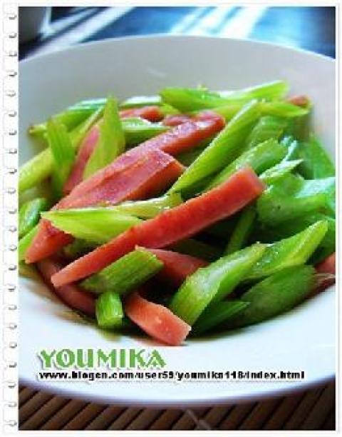 2.待熱後,倒入西芹,火腿爆炒,片刻後加入少许鹽,醋番炒均匀,即可出锅~這道菜也可直接用以上材料凉拌食用。