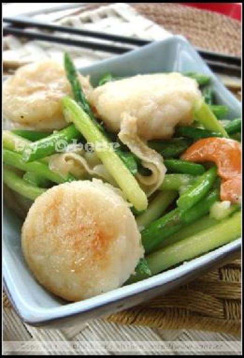 1.鲜芦笋洗净,切去尾段,再每条切开3段,放入已滚的热水,用少许油氽烫 (约5分钟)。扇贝肉用少许盐 胡椒粉,生粉腌一腌。