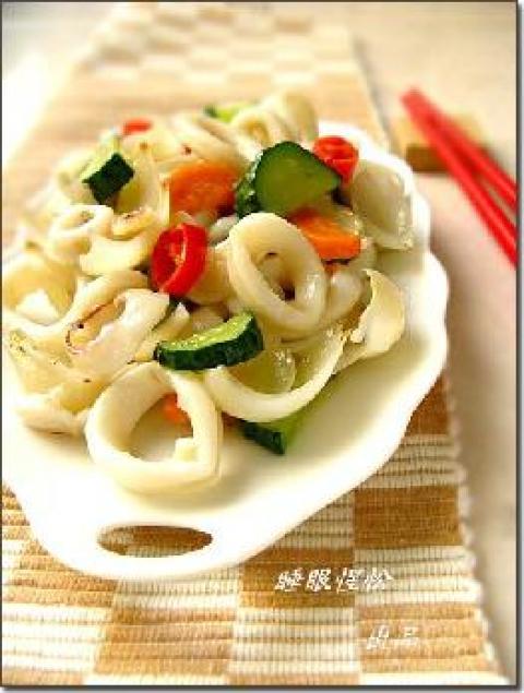 1.将鱿鱼洗净切圈,黄瓜胡萝卜洗净都切半圆。