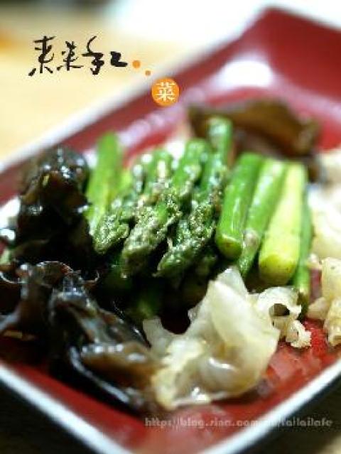 芦笋300g,水发黑木耳3朵,银耳2朵,豆豉酱,蒜末,盐2g