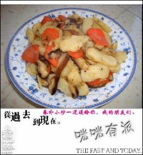 2.锅中倒少量油,油热后先炒胡萝卜片,然后是香菇皮,这里放一些胡椒粉。