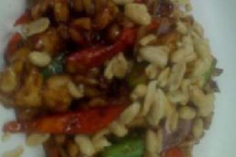 鲜鸡肉脯.杏仁.青红椒.洋葱块.,泰式顶上辣酱.酱油.蚝油.味料.高汤.水生粉.