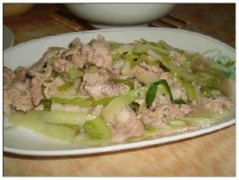 2.炒锅下油爆香蒜头,把猪肉拉熟盛出.