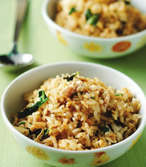 3.在作法2中加入香米白饭,以大火炒至饭粒松散后,加入盐炒匀,再加入作法1的香菜末拌匀,熄火后拌入另一茶匙的garammasala印度香料粉即可。