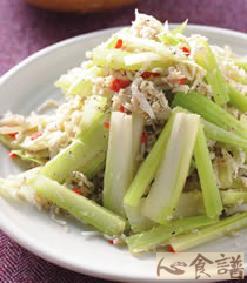 3.加入西芹条略拌后,续加入调味料炒至干松即可盛盘。