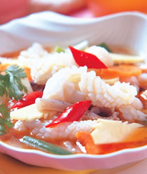2.热油锅,将葱、姜、辣椒爆香,放入高汤以小火煮开,再放入作法1的花枝、香菇、洋葱、胡萝卜一起以大火煮3分钟后,放入白醋、冰糖、盐继续煮1分钟,慢慢倒入太白粉水芶芡,最后滴上香油即可。