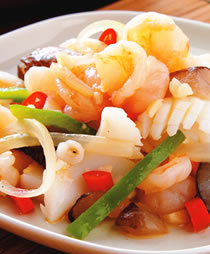 3.热一锅,放入油、蒜末、姜末爆香,再放入作法2的洋葱丝,炒数下加入作法1的虾仁、花枝片、海参块与作法2的青椒丝,炒至虾仁变红。