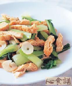 3.炒锅放入3大匙沙拉油爆香姜片,再加入青江菜、所有调味料炒熟,最后放入豆包拌炒均匀即可。