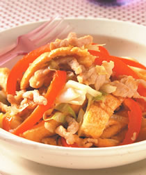 土司边150公克,肉丝50公克,红甜椒1/4个,高丽菜丝20克,洋葱丝15公克,沙拉油2大匙,蚝油1茶匙,盐1/4茶匙,胡椒粉少许,酱油1茶匙,酒少许,太白粉1茶匙