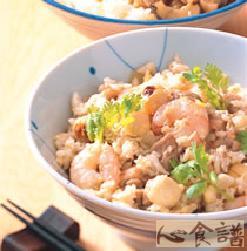 虾仁30公克,鸡腿肉80公克,蟹肉30公克,洋葱30公克,蒜头1瓣,椰奶饭3碗,蛋1颗,香菜少许,酱油1小匙,香油1小匙,盐少许,胡椒粉少许,鱼露1小匙