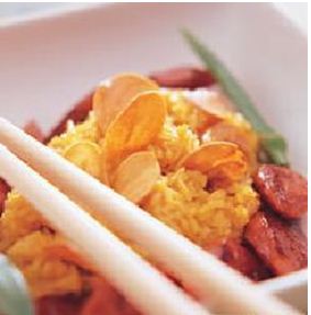 4.将作法2回蒸的越光米饭撒上咖哩粉,淋上作法3中少许炒过蒜片的橄榄油,饭上撒蒜片,再将作法4的辣香肠片排入盘中即可。