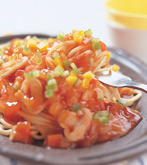 油面200公克,素火腿丁60公克,蕃茄2个,蘑菇片100公克,青椒丁10公克,黄甜椒丁10公克,植物性奶油1大匙,素高汤200㏄,蕃茄酱1大匙,ok酱1/2大匙,盐1/3小匙,细砂糖2小匙,太白粉1小匙,水2小匙