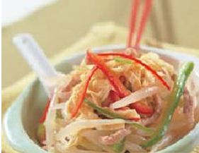4.热油锅,以小火炒肉丝及青椒丝、红甜椒丝,倒入作法2的银针粉与所有调味料一起炒至味道均匀时,加入韭黄段及豆芽拌炒均匀即可起锅,装盘后洒上蛋丝即可。