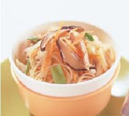 3.取不沾锅,放入橄榄油烧热,加入香菇、酱油炒香,放入作法2的其余材料炒软,加入米粉、绿豆芽、鸡肉及水、味醂拌炒均匀即可。