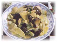 (三)用1汤匙油将冬菇、笋片略炒,再放下腐败皮、腐球,加入调味料,略煮至汁收干少许,然后加入小棠菜炒匀即成。