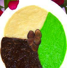 (1)、炒勺放在中火上,加入花生油(50克)、白糖(50克),烧至糖溶化时,加入赤豆泥,改用微火炒至松散起沙时,盛在盘内中间;栗子泥用同法炒好,盛在盘内赤豆泥的一边;山药泥也用同法炒好,盛在盘内赤豆泥的另一边。