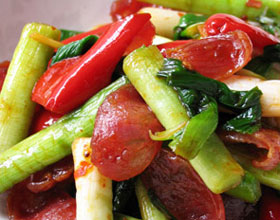 主料:香肠500克,青蒜200克,