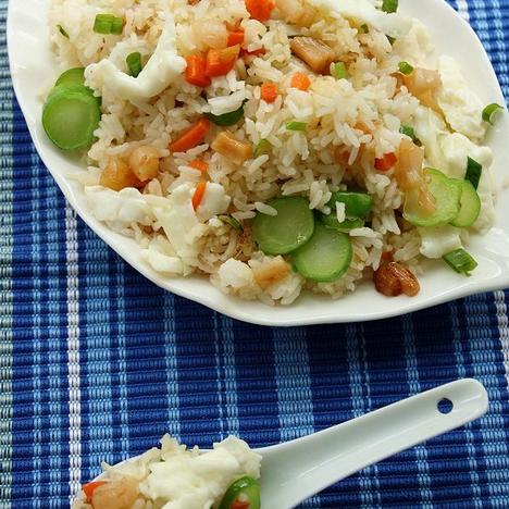3. 热油锅,先将蛋白下锅炒至半熟时,加入白饭炒至米粒呈松散状,再放入作法1及作法2的材料继续拌炒,添加适量的鲜鸡晶与盐调味即可食用。