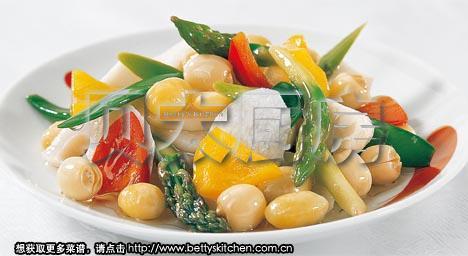 莲藕1节,山药1/2根(约200g),莲子1汤匙(15g),白果1汤匙(15g),荷兰豆50g,红菜椒1/2个,黄菜椒1/2个,芦笋50g,马蹄5枚,盐1茶匙(5g),油4茶匙(20ml)