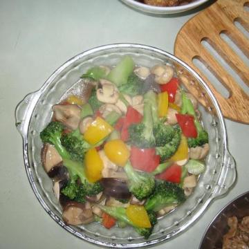 将西兰花、蘑菇、香菇、红菜椒、黄菜椒同时放入炒锅中,加入一小勺油,开中火,盖上锅盖,待锅边有水蒸气冒出后,关火,开锅。