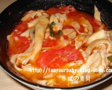 3、放入西红柿,加入盐、白糖、鸡精、料酒,用旺火烧开,再用小火焖3—5分钟即可出锅。