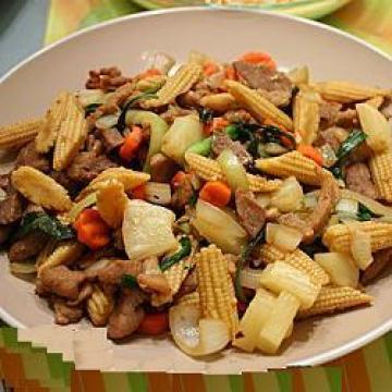 主材:,枚头猪肉450克,切丝,蒜蓉1汤匙,中个洋葱1个,去皮切丝,玉米笋8条左右,切段,葱2条,去白切段,胡萝卜1棵,切粒,干葱蓉1汤匙,九层塔叶10多片,植物油适量,汁料(份量只供参考):,鱼露2汤匙,糖1/3茶匙,花雕酒1汤匙,腌汁:,酱油、生粉、糖、盐、水和油适量