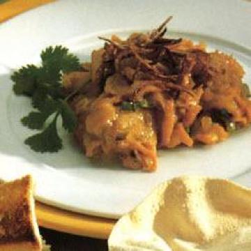 6.放入香菜末,拌炒均匀,盛入上菜盘后覆以炸洋葱丝,用香菜点缀,与印度脆饼或烤饼同吃。