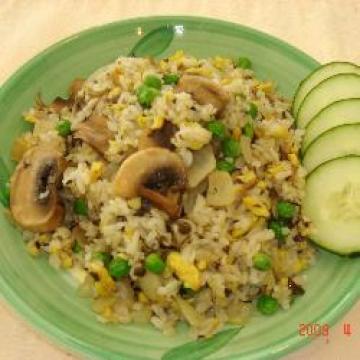 煮好的米饭250克,芽菜20克,蘑菇50克,鸡蛋2个,洋葱半个,嫩豌豆50克,精盐2.5克,植物油25毫升