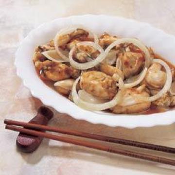 4.洋葱、百合回锅,加入麻油、酱油等调料及生姜丝。用太白粉水勾芡,盛入大盘即可上桌。