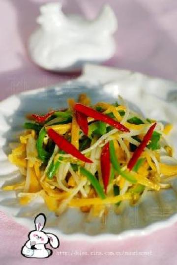 2、将饼、青椒,切尽量和豆芽长短一致的细丝。