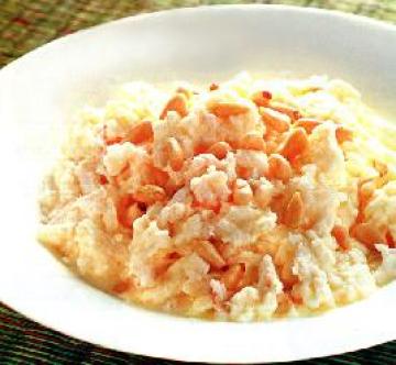 主料:鲜牛奶250克,鸡蛋清250克,鸡肝25克,味精3.5克,蟹肉25克,精盐4克,腌虾仁25克,干淀粉2克,炸榄仁25克,熟猪油500克,熟瘦火腿15克