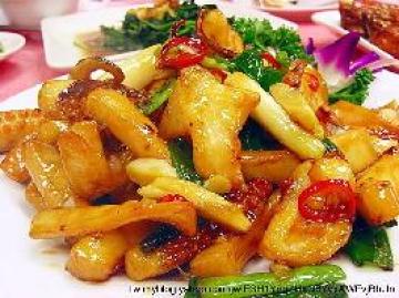 材料:软丝500克,红辣椒2根,豌豆荚200克,黑木耳40克,姜片30克,葱段30克