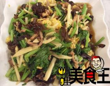 主料:木耳(水发),75克,竹笋75克,猪肉(瘦)75克,油菜75克,鸡蛋150克,