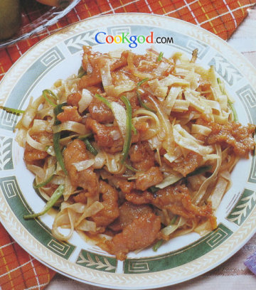 4、炒锅留底油烧热,下葱头丝炒香,烹料酒,加糖、老抽、蚝油、牛肉、河粉、尖椒丝,翻炒均匀出锅即成。