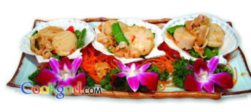 3、锅内放入色拉油30克,烧至七成热时放入红椒蓉、蒜蓉小火煸香,放入瑶柱酱、生抽、元贝肉、蜜豆大火翻炒30秒,烹入白兰地酒翻匀后出锅,装入元贝壳内,并用胡萝卜丝、兰花、香芹装饰即可。