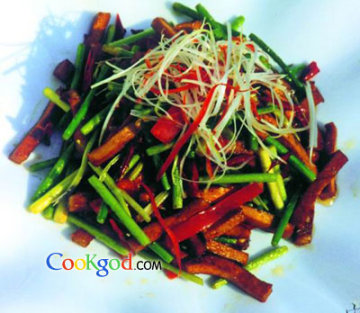 4、锅底留10克底油,下蒜苔、芹菜梗、蒜蓉、干辣椒大火炒香,再放入老抽、上色的香干、五花肉、金兰油膏大火翻炒均匀即可。