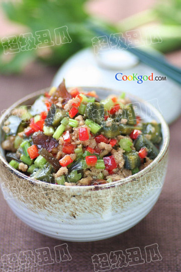 4)炒锅中补充少量油,加热后倒入香葱碎和姜末爆香,倒入香芹菜碎,红辣椒碎和皮蛋丁翻炒1分钟后,倒入炒好的肉馅,调入豆豉酱,盐和糖,再翻炒1分钟后,撒入鸡精搅匀即可。