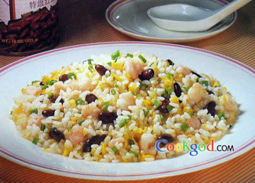 材料粳米饭150克,鸡蛋1只,葱花10克,上浆小虾仁25克,红腰豆罐头(花豆罐头)35克调味料植物油250cc,味精2克,盐、胡椒粉少许