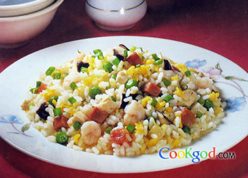 材料1、粳米饭150克,鸡蛋1只,葱花10克2、上浆小虾仁15克,熟火腿丁15克,熟鸡丁15克,香肠丁15克,青豆15克,冬笋丁15克,水发香菇丁15克调味料味精2克,植物油500cc,冷猪油30克,盐、胡椒粉少许做法1、用旺火将锅烧热,放入植物油滑锅,然后入油500cc。2、将油烧至四成热,放入上浆小虾仁过油。3、随后放入熟火腿丁、熟鸡丁、香肠丁、青豆、冬笋丁、水发香菇丁滑油至熟。4、然后用沥勺捞出待用。5、锅内入冷猪油30克,放入打散的蛋液炒至八成熟,再放入米饭炒散。6、加入