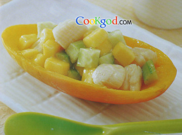 3、锅置火上,放油烧热,下姜片、黄瓜丁炒香,再放入芒果、带子,加盐炒几下,用水淀粉勾芡,盛入芒果皮中即可。