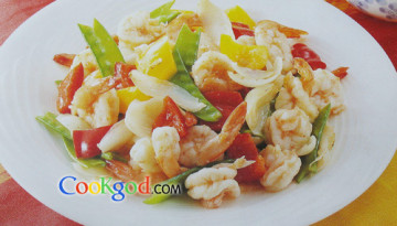 材料鲜虾400克 鲜百合1个 红、黄柿子椒各半个 豌豆夹12片 嫩姜1小块 鸡蛋1个调味料a料:盐、水淀粉各l小匙b料:盐、胡椒粉各1小匙 水淀粉1大匙c料:高汤3大匙 盐1小匙 甜酒2大匙