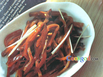 2、炒锅上火烧热,加适量底油,用葱、姜丝炝锅,下入肉丝煸炒至变色,烹绍酒,再放入榨菜丝、酱油、白糖、味精,添少许汤,翻炒至熟,用水淀粉勾薄芡,淋香油,出锅装盘即可。