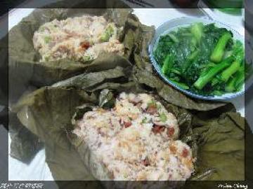 主料:荷葉,適量的冷飯,瑤柱,咸魚,一點薑米(即薑末),一點蒜蓉,一點菜遠(切片) ,叉燒粒(熟的肉粒),雞蛋一粒(材料可以自由配搭)
