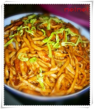 6)酱汁烧开,加入面,旺火炒至与配料完全混合。