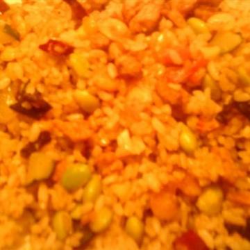 米饭300g,香葱2根,生姜5g,洋葱5g,干红椒5个,香菇2个,木耳2朵,西红柿半个,黄瓜1/4根,牛肉100g,虾仁70g,青豆50g,番茄酱10ml,鸡蛋3个,黑胡椒粉,孜然粉以个人口味酌量
