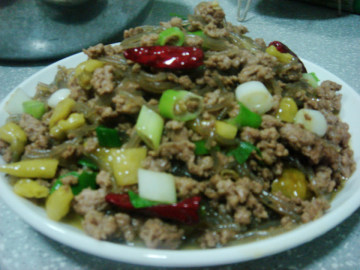 3、用锅中剩余的油炒野山椒,待野山椒炒出汁儿就放入苕粉,快速翻炒,倒入少许野山椒水翻炒均匀,再倒入肉馅翻炒,最后放入大葱段儿翻炒,待大葱香味出来后就关火装盘了!