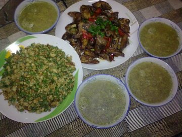 第一种:炒菜菜谱『豆角蛋、素炒矮瓜(茄子)& 擂茶(加绿茶粉) 。』做法