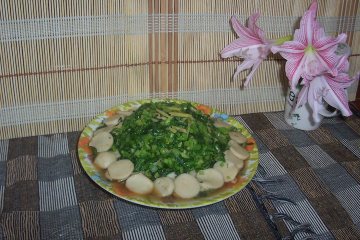 第一种:炒菜菜谱虾米鱼丸片炒菜心粒做法