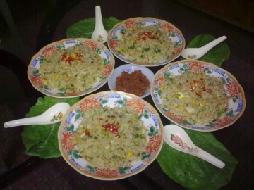 白兰他香炒饭、【油炸草虾球】搭配【马来风光】、炒花生、阿婆酸豆角辣炒猪肉碎、韭菜炒海肠